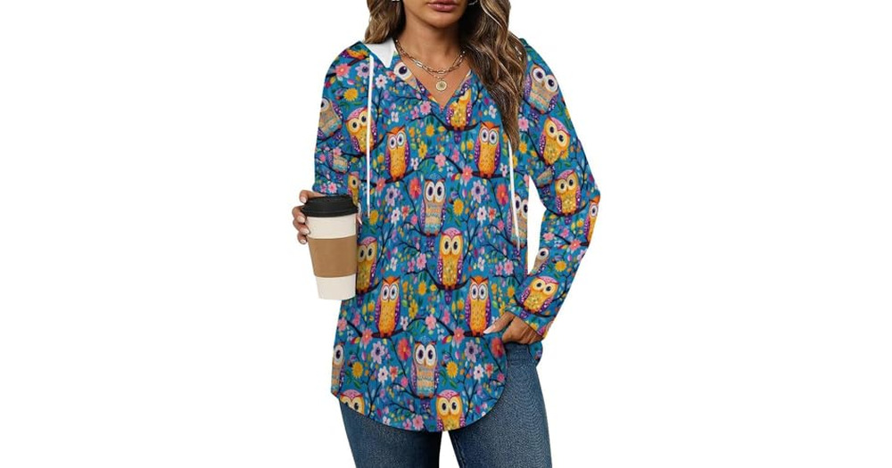 Novastar Long Hoodies for Women Trendy - Flower Owl Print Cozy Loose Fit Ladies Sweatshirts Athleisu