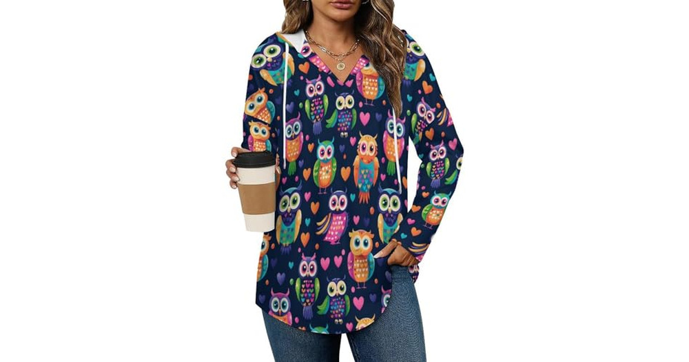 Novastar Long Hoodies for Women Trendy - Cartoon Cute Owl Print Cozy Loose Fit Ladies Sweatshirts At