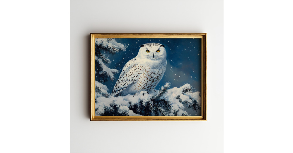 Serene Snowy Owl in Winter Woodland - Moody Realistic Painting, Rustic Winter Decor, Snow-Dusted Pin