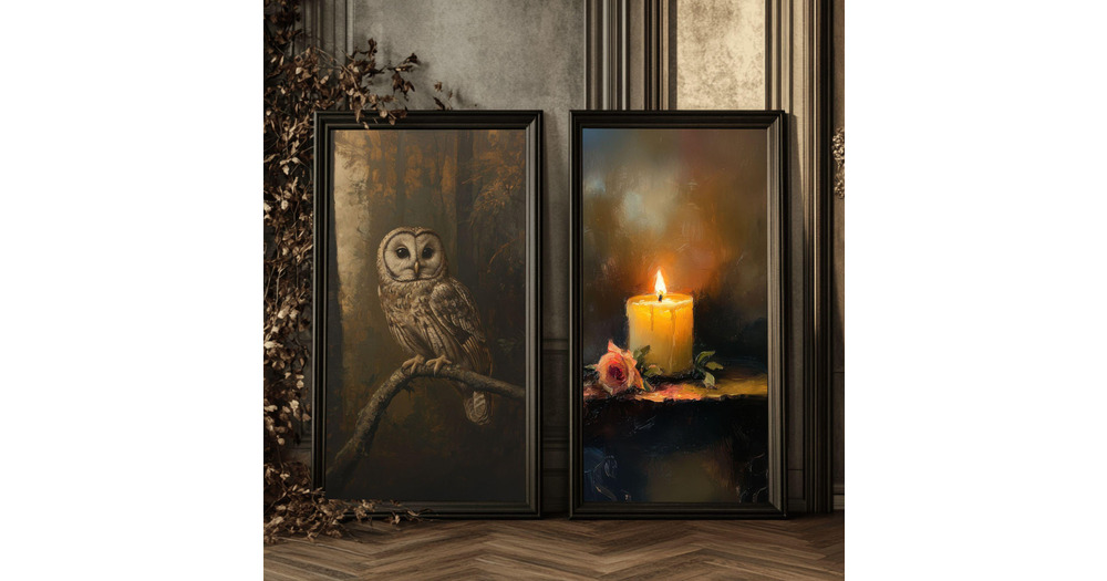 Gothic Owl Wall Art Digital Download Set | Candle Light Print | Dark Academia Room Decor | Cottageco