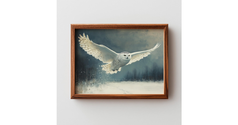Rustic Snowy Owl in Flight Painting - Moody Winter Wall Art, Nature-Inspired Decor, Soft Neutrals Bi