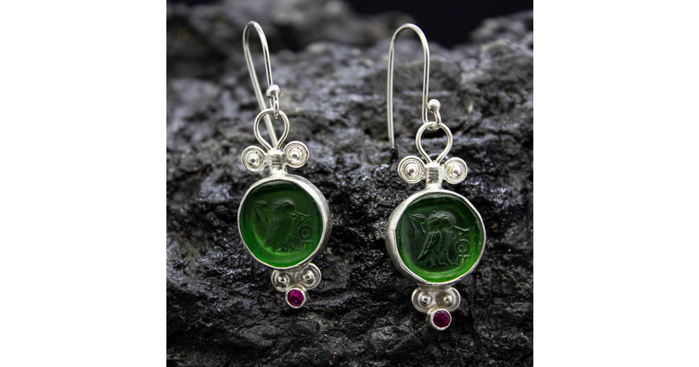 Roman Art Owl Intaglio Glass Earrings | 24K Gold Over 925 Sterling Silver |  Ancient Greek Athena Ow