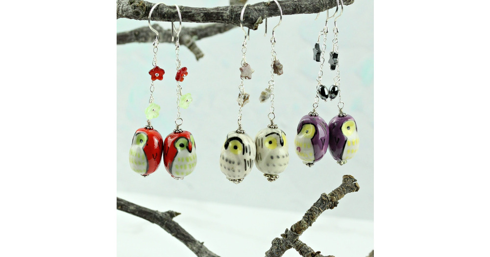 Colourful Owl Earrings. Long Bird Earrings. Nature Earring Gifts. Owl Jewellery for Her. Porcelain C