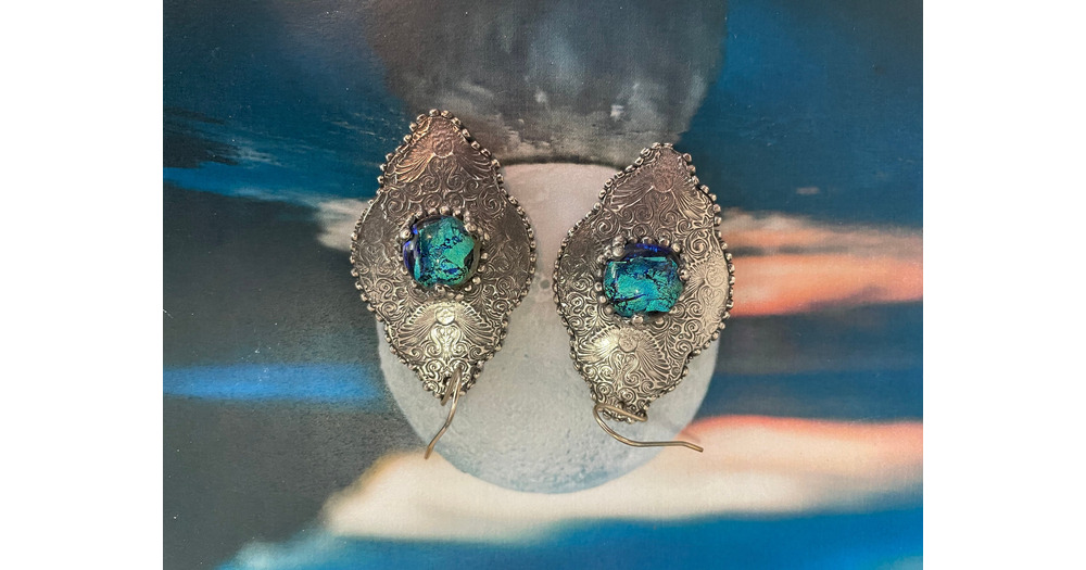 Sterling Silver Statement Drop Earrings With Owl Texture and Blue Dichroic Glass Gemstone