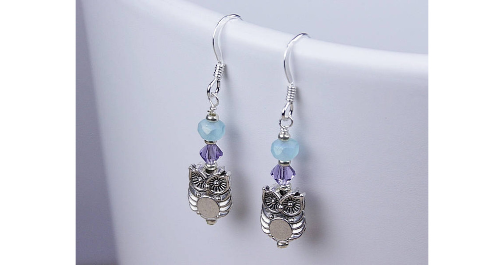 Lavender Purple Aqua Blue Swarovski Crystal Silver Owl Earrings
