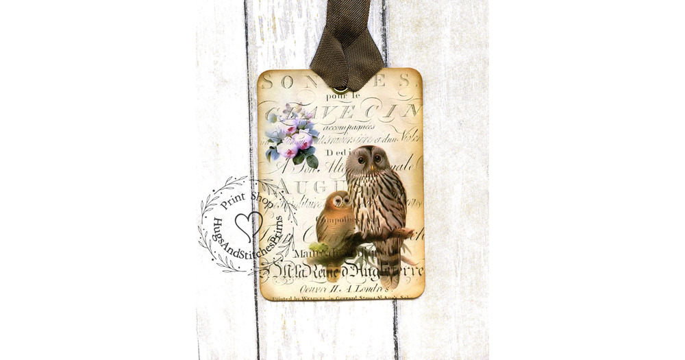 French Brown Owl Pair Gift or Scrapbook Tags or Magnet #60