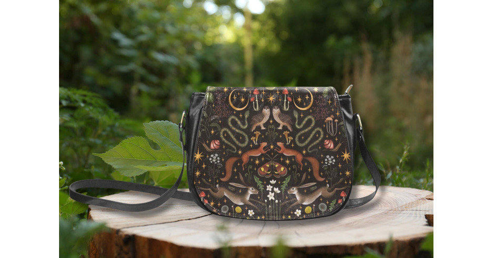 FAIRY FOREST Crossbody Saddle Bag with Owl Rabbit Squirrel Mushroom Moth Moon & Wildflowers, Woo