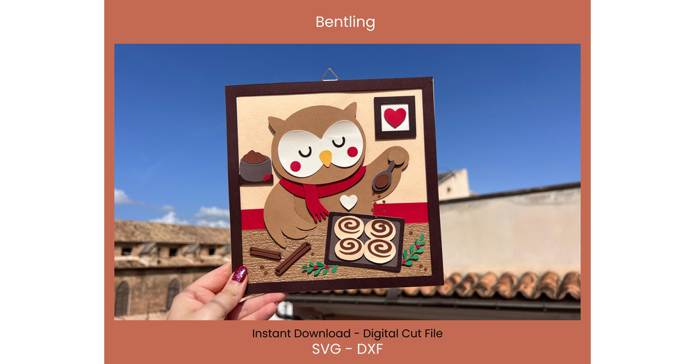 Christmas Owl Baking Cinnamon Rolls SVG DXF, Layered Paper Square Sign, Holiday Kitchen Wall/Door De