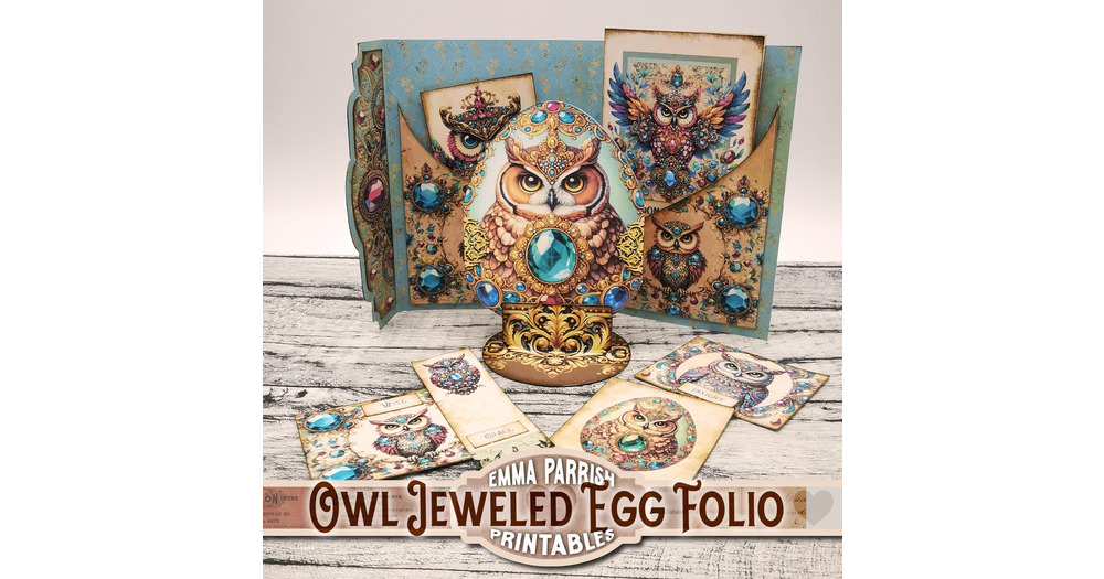 Jeweled Owl Printable Folio Kit, Mini Egg Folio, Tags & Pockets, Junk Journal, Papercraft, Card