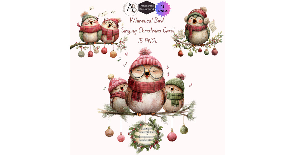 Christmas Birds Clipart - Quirky Owl Carolers: 15 PNGs for Funny Holiday Cards (Digital Download), S