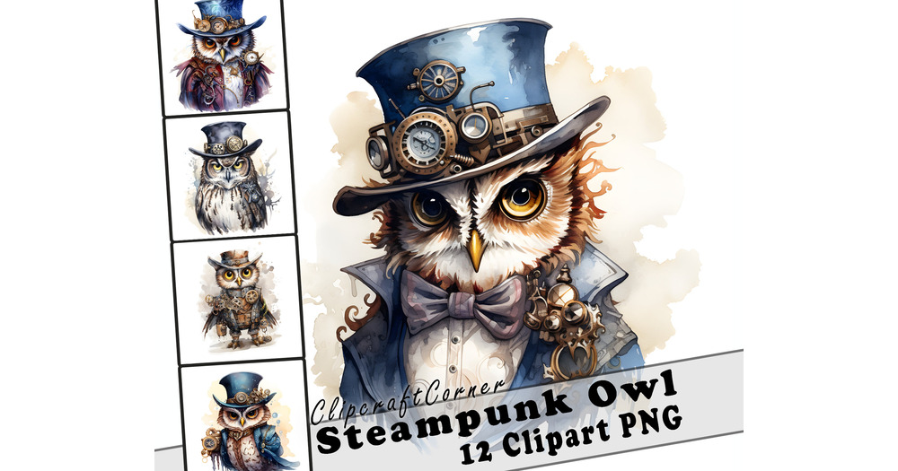 12 Steampunk Owl Clipart PNG Animal Bundle | Watercolor Steampunk Owl Clipart PNG Art | Animal Artwo