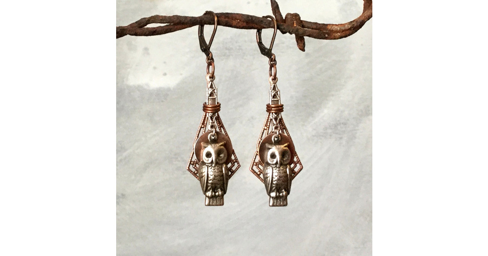 Handmade Silver Owl Earrings, Art Deco Owl Earrings, Owl Filigree Earrings, Unique Assemblage Earrin