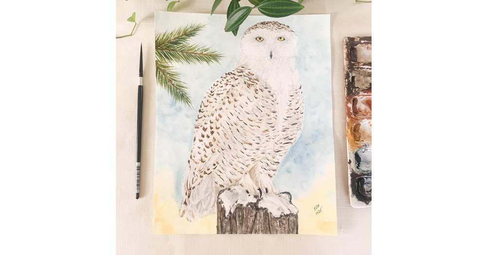 Snowy Owl In Winter Original Watercolor Painting. 9 x 12 Unframed Wildlife Bird Painting.