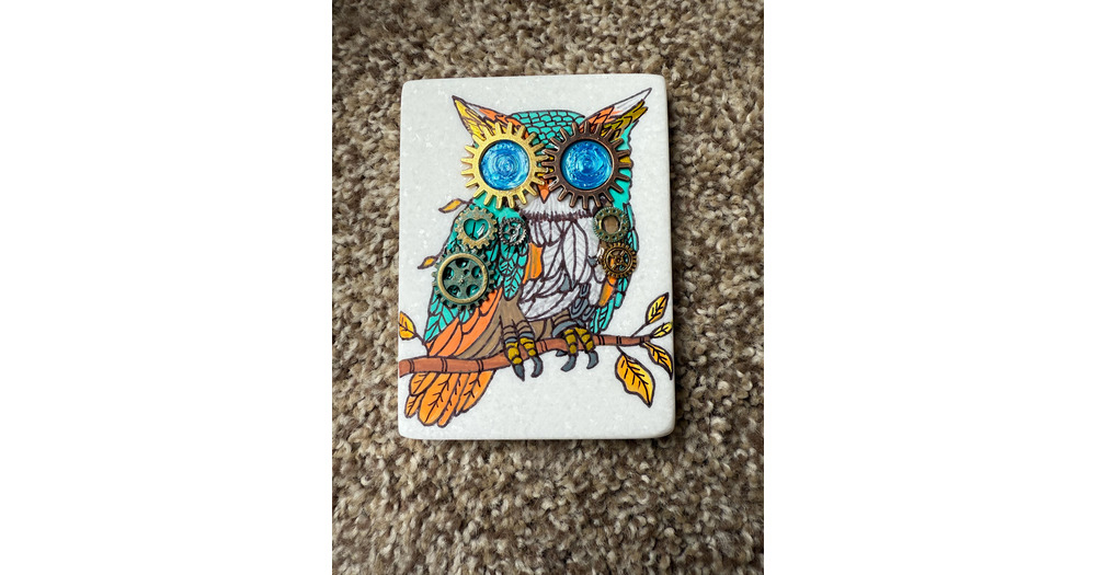 Whimsical Steampunk Owl painted rock SEALED 3D metal gears painted rocks