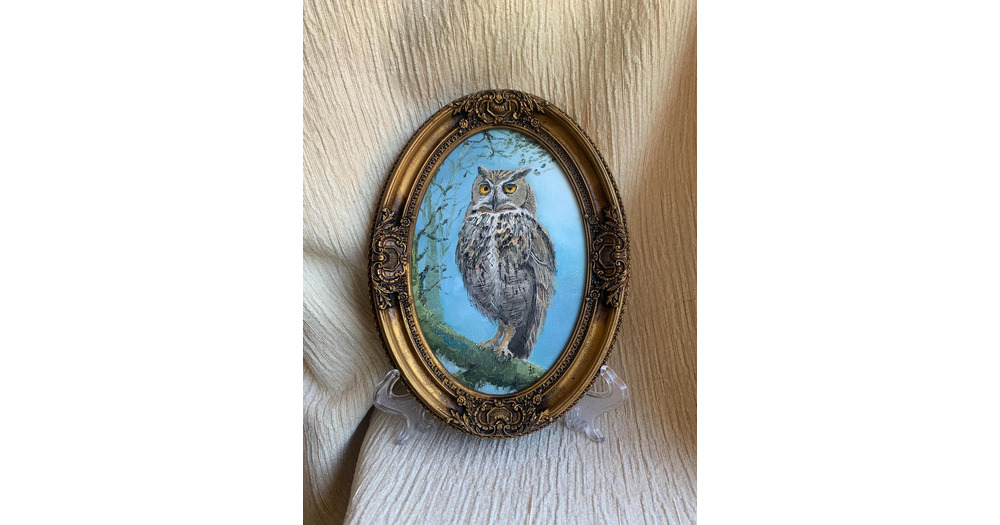 Framed Owl Oil Painting: Shabby Chic Gold Frame, Symbol of Wisdom