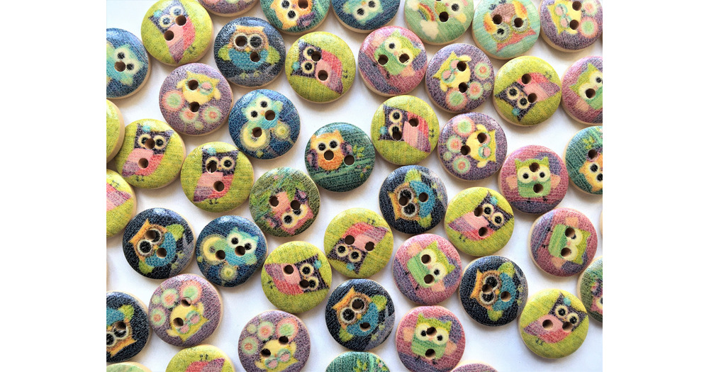 15 mm OWL BUTTONS x 10, Natural backs cute wooden owl buttons, Painted bird buttons, wooden owl butt