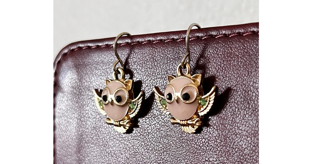 Vintage Rare Gold Tone Pink Owl Wearing Glasses Earrings Super Cute