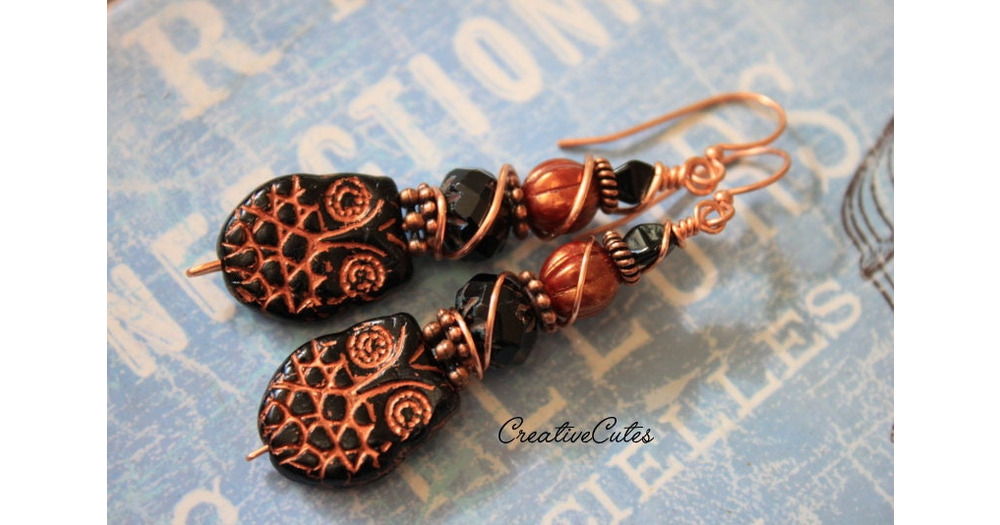 Boho Copper Owl Earring, Black & Copper Czech Bead Earrings, Stacked Bead Owl Earrings, Cute Boh
