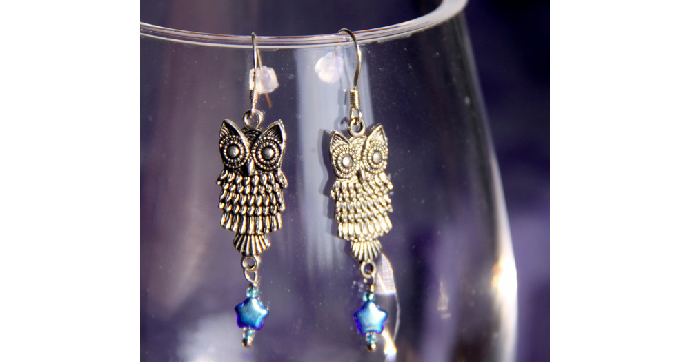 Sterling Silver Owl Earrings: Aurora Borealis Blue Star Pewter Charms