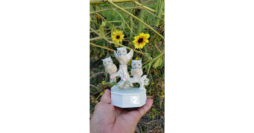 Vintage Porcelain Owls Music Box, Owls Figurine on a Branch Rotating Music Box, Plays " Feeling