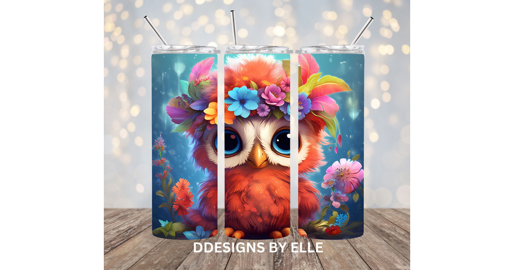 3D Owl and Flowers 20 oz Skinny Tumbler, Sublimation Design, Straight Tumbler Wrap PNG, Sublimated T