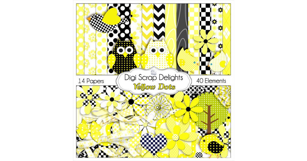 Yellow & Black Scrapbook Kit: Dots, Daisies, Owls (Digital Download)