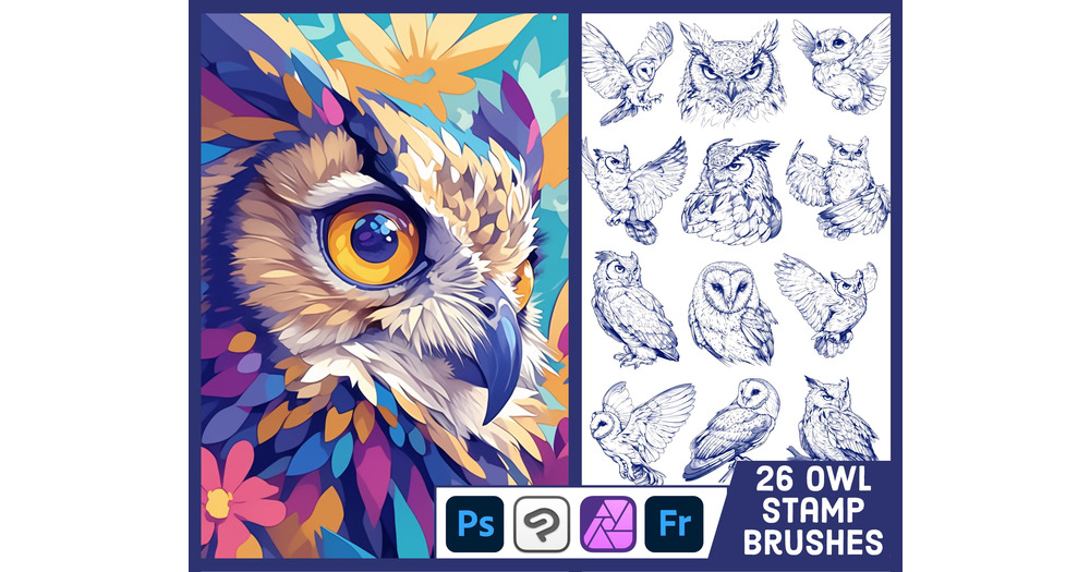 26 Owl Stamp Brushes Photoshop, Clip Studio Paint, Affinity Photo, ABR Brushes, Owls Brush Set