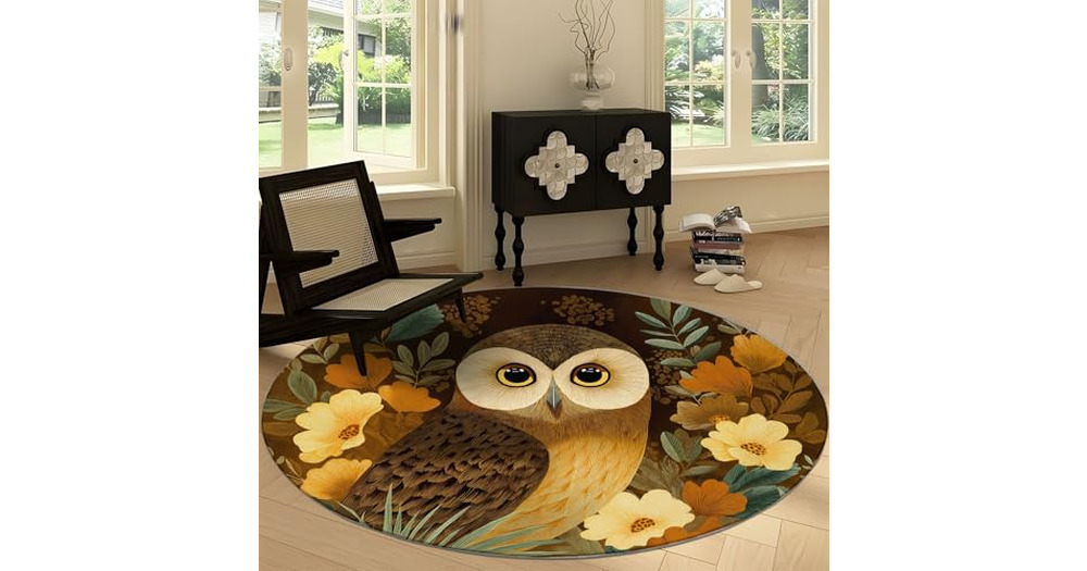 Washable Retro Area Rug Round 2' x 2', Flowers Grass Animal Owl Throw Low-Pile Indoor Roun