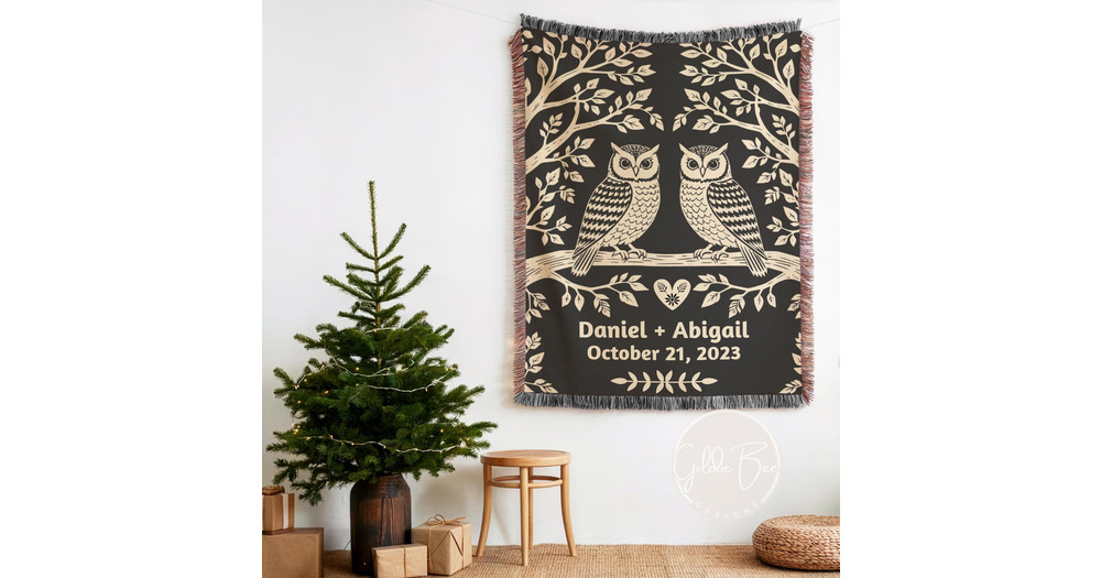 Personalized Lovebirds Woven Blanket: Owl Couple Names & Date Throw