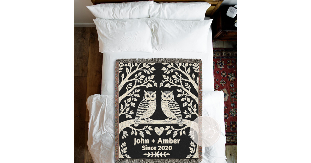 Custom Owl Couple Woven Blanket: Personalized Names and Date Throw