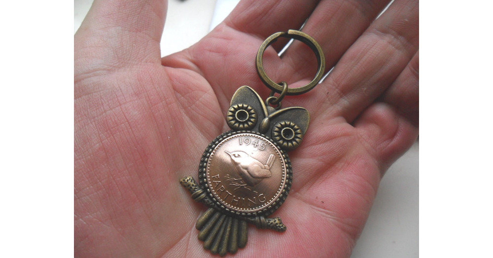 80th birthday gift Owl Key Fob owl gift with British 1945 bird coin gift for a woman gift for a man