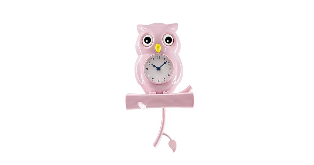 Lily's Home Pink Owl Pendulum Wall Clock with Revolving Eyes, Swinging Branch, Wall Mountable,