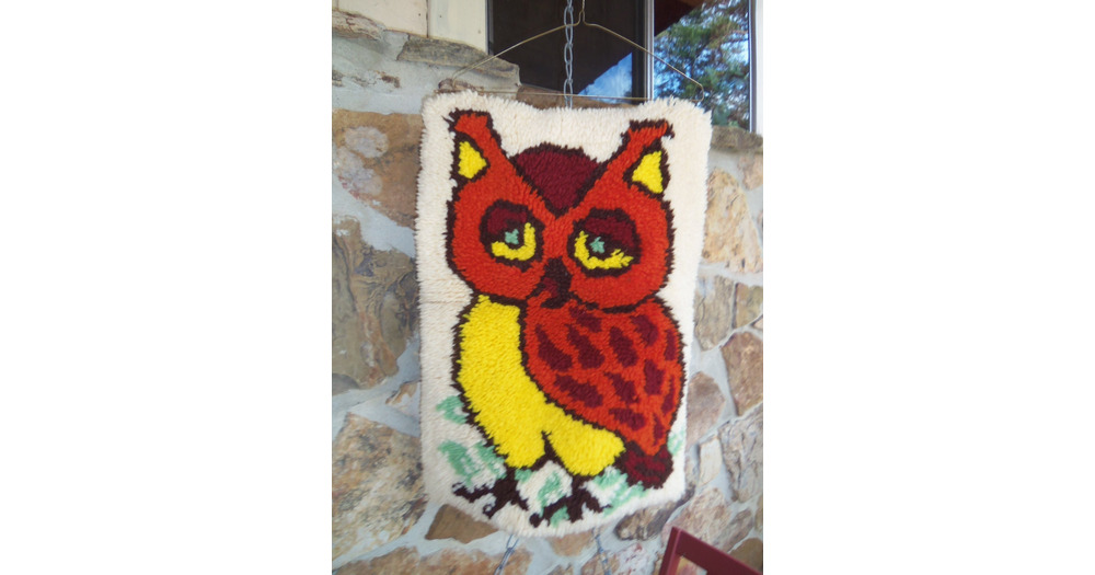 70s Handmade Owl Hook Rug: Vintage Wall Hanging