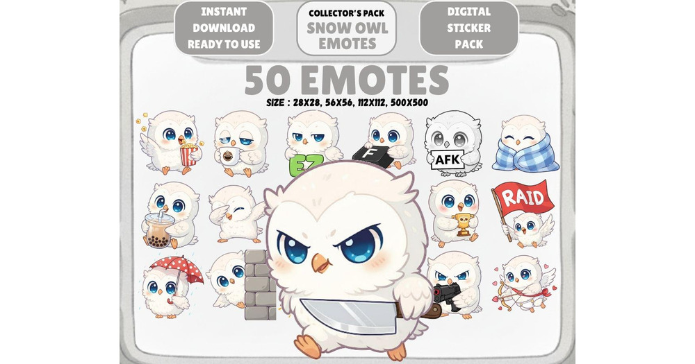 50 Kawaii Baby Snow Owl Chibi Emotes: Twitch Discord PNG Pack (Digital Download)