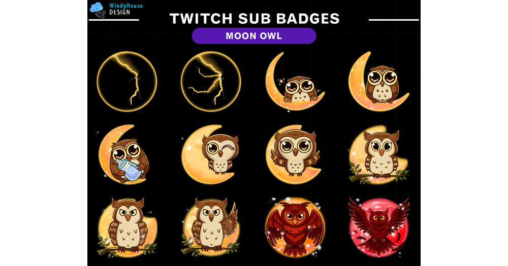 Moon Owl Twitch Sub Badges, Cute Owls Evolving Badges with Moon Phases for Streamers