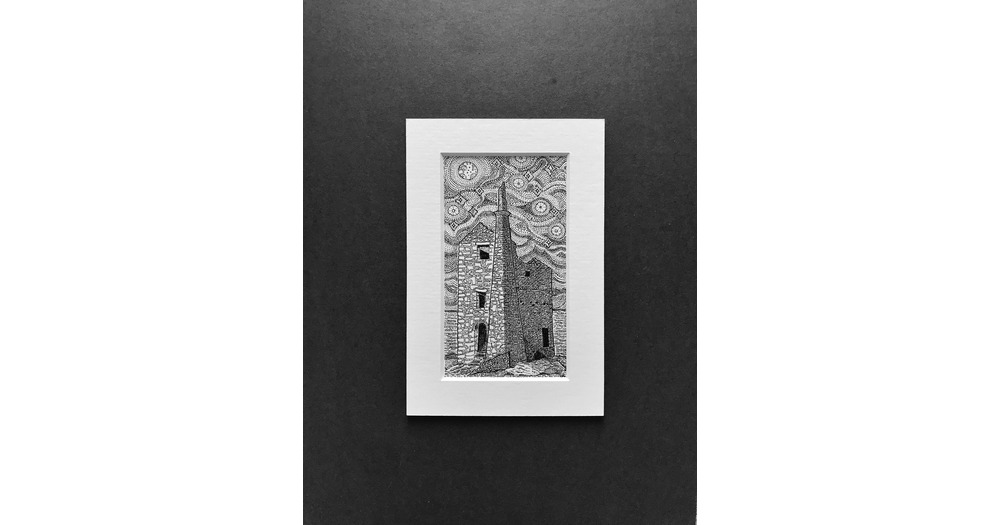 Wheal Owles Mine, St Just, Art print of an ink drawing of the tin mine under a starry sky, cornish g