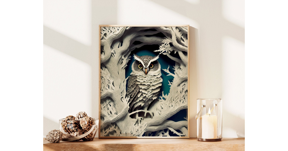 Owl Paper Cut Print, Owl Art, Ai Art, Owl Themed Artwork, 3D art, Cool Wall Art, Forest Themed Poste