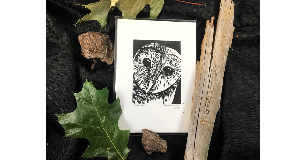 Barn Owl Hand-Pressed Linoleum Print, 5x7 Wall Art