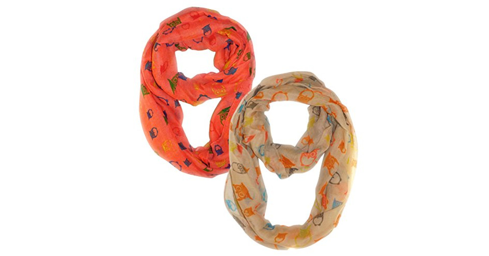 Peach Couture Beautiful Vintage Owl Print Infinity Loop Scarf in 2 pack (Coral and Tan)