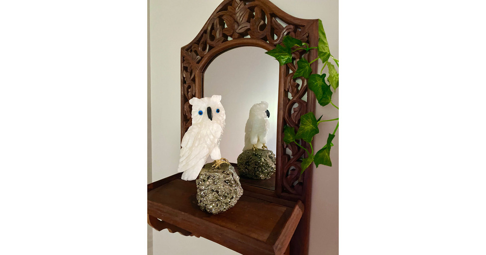 White Onyx hand carved Owl on Pyrite - home décor or unique table piece