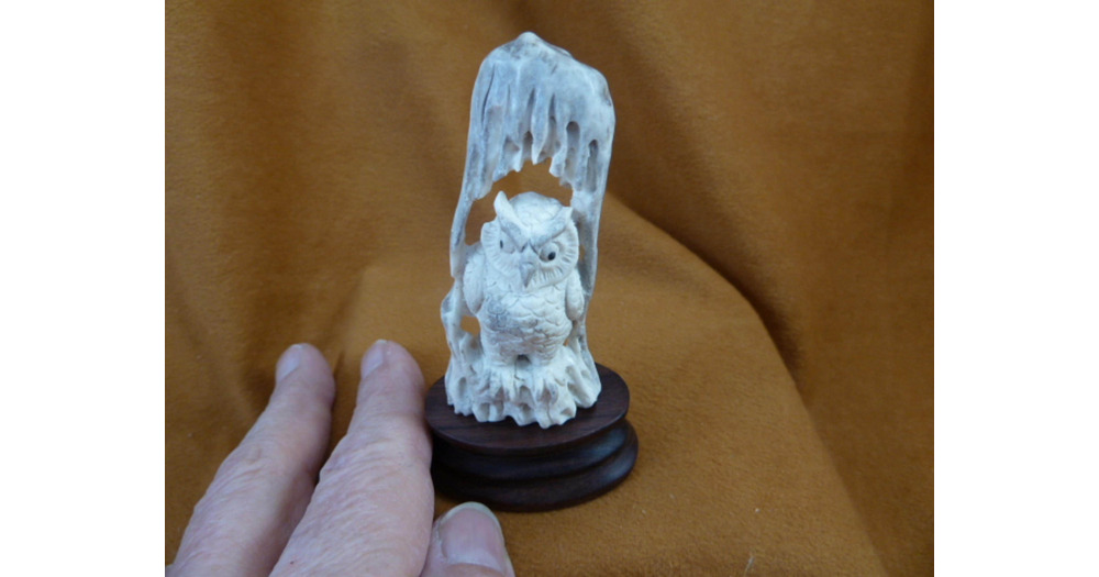 little small white Horned Owl of shed ANTLER crown base figurine Bali detailed carving of shed Moose