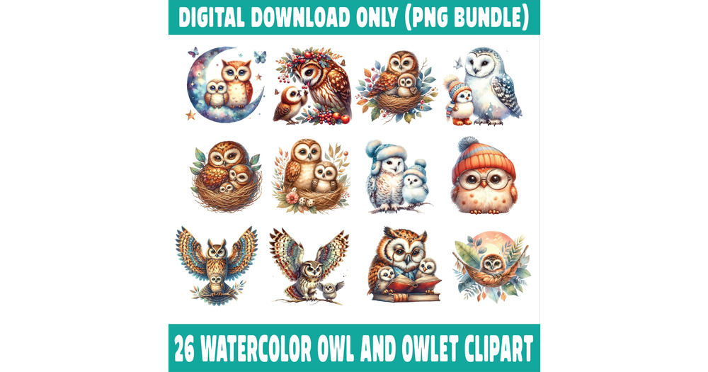 26 Watercolor Owl Clipart Bundle, Cute Owlet PNG Set, Digital Download Owls, Baby Owl Clipart, 12x12