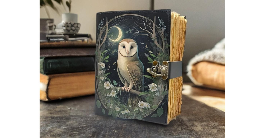 Large Leather Grimoire Journal: Owl Print, Celestial Book of Shadows