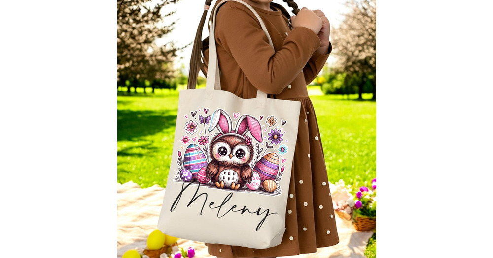 Owl Easter Tote Bag, Bunny Ears Egg Design, Spring Holiday Gift, Kids Easter Basket, Girls Easter Hu