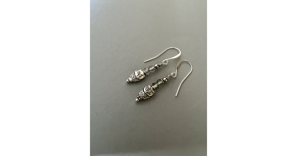 Small Owl Silver Dangle Earrings Light Gray Crystal