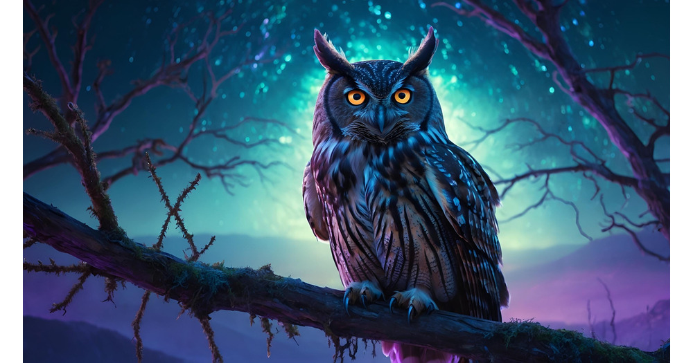 Cyber Spirit Owl – Mystical Aurora Guardian Wall Art, Digital Fantasy Animal Poster