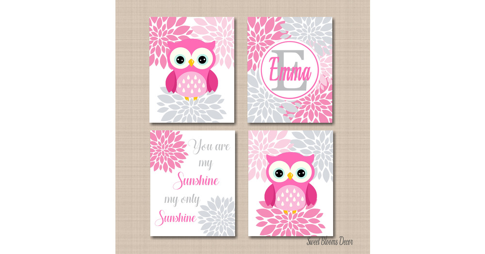Pink Gray Owls Nursery Wall Art Floral Baby Girl Bedroom Decor Flowers You Are My Sunshine Shower Gi