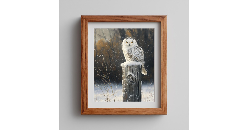 Snowy White Owl on Frosty Fencepost - Moody Winter Wildlife Printable Art, Rustic Cabin Decor, Seren