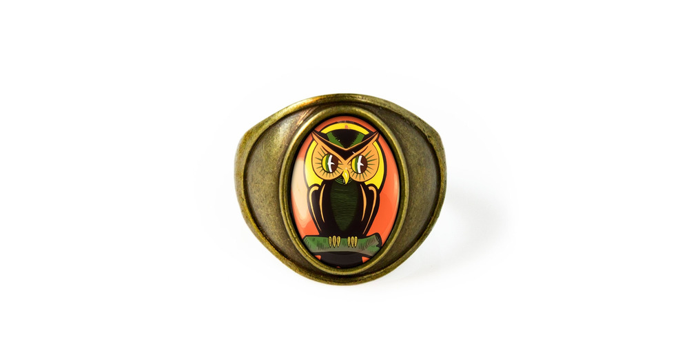 Retro Cartoon Halloween Owl Vintage Art Glass Antique Bronze Size 7 Glass Ring 144-BSOR