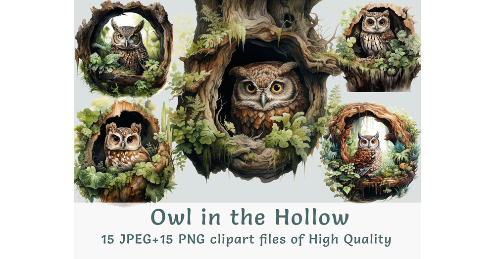 Watercolor Owl Clipart 15 High quality PNG and JPEG files owl in hollow illustration nursery sticker